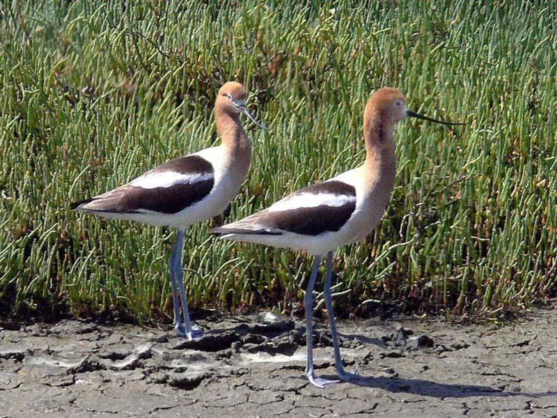 The American avocet is a large shorebird. It is 16-20 inches tall and has very long, grayish-blue legs; a long neck; and a long, turned-up black bill. The female's bill turns up a little more than the male's bill. Its head and neck are rusty-red in the summer and grayish-white in the winter. It has black wings with white stripes and a white body.