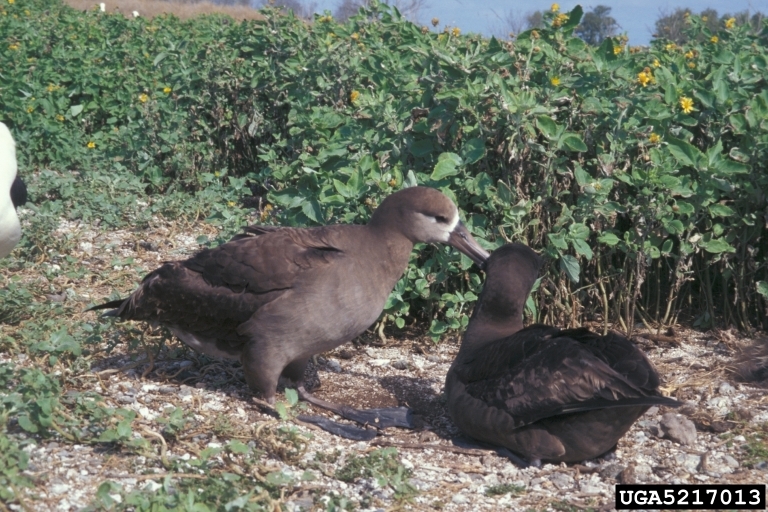 Females lay one egg in a shallow depression in the ground. The black-footed albatross nests on islands in colonies. Both the male and the female incubate the egg and feed the chick regurgitated food. Once a chick leaves the nest, it won't return to its breeding island for five or six years, when it is fully mature. The black-footed albatross mates for life.