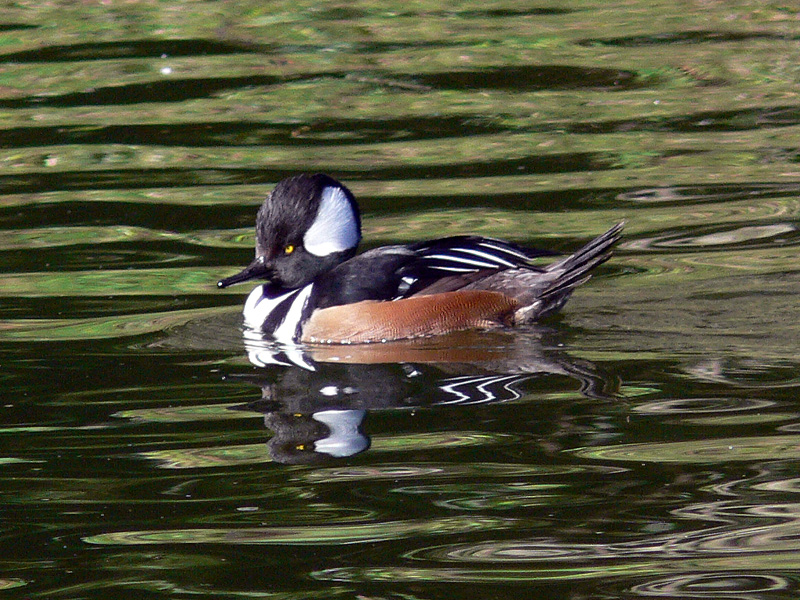 The adult male hooded merganser has a white fan-shaped crest on his head. He has bright yellow eyes, a black head, a white chest with two black stripes, a brownish-black back, rust-colored sides, and a grayish-brown rump and tail.