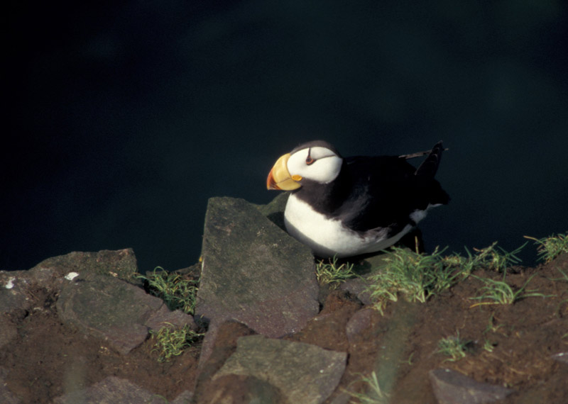 In order to get airborne, the puffin must run on the surface of the water for a long distance. The horned puffin will also will dive off cliffs to take flight.