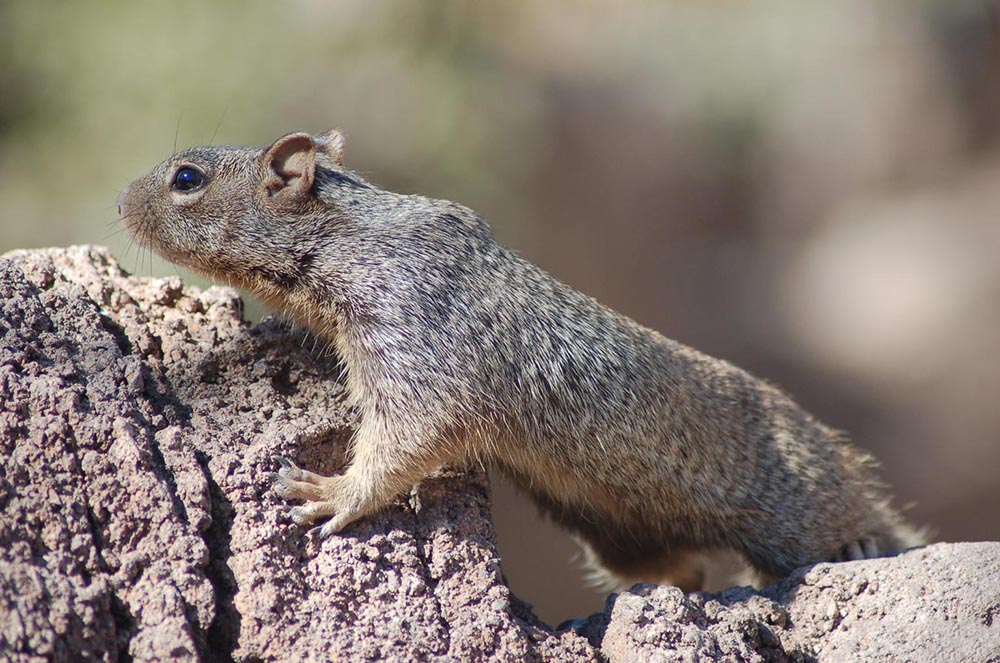The rock squirrel is a large ground squirrel that is 17-21 inches in length. It is mottled gray on its uppersides with a brownish rump and creamy white on its undersides. It has a long bushy tail with white edges.