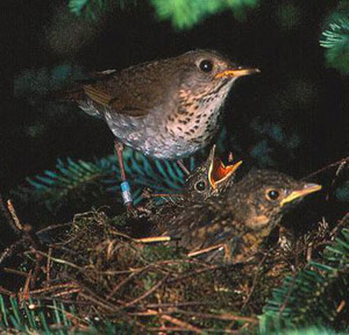 With twigs and moss, the Bicknell's Thrush builds a nest in the shape of an open cup. In the nest, the female lays 3-4 bluish green eggs with light brown spots. Upon hatching, the young chicks don't have any feathers and are helpless. They rely on their parents for food until they first leave the nest after 9-13 days.