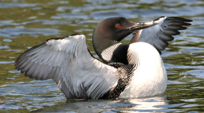 The Common Loon lives on quiet, remote freshwater lakes. In the winter, it is found on lakes, rivers, estuaries and coastlines. The Common Loon is an indicator of water quality because it needs clear water to see swimming fish beneath the surface. The Common Loon breeds in New Hampshire.