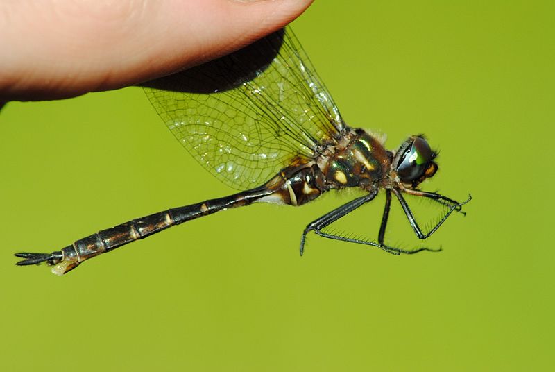 The dragonflies in this family are large, usually between 1.5 and 3 inches in length. They have bright green eyes, and many species are black with metallic green or yellow markings.
