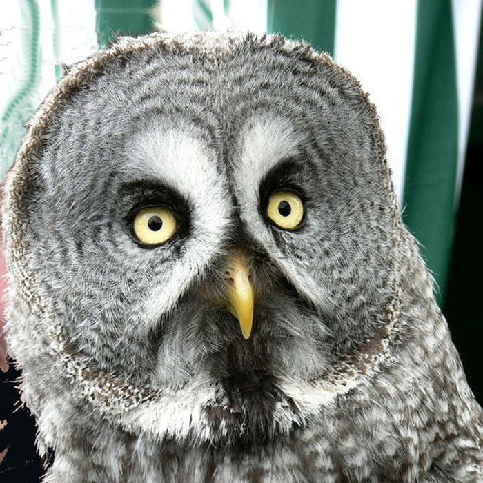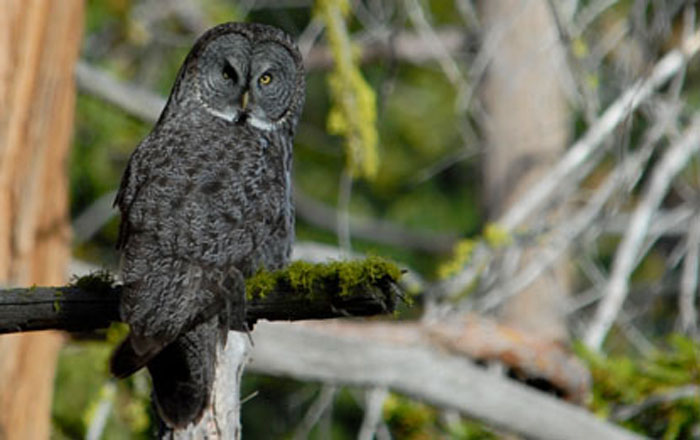 The Great gray Owl deserves its name because it is the largest owl in North America. It is between 24 and 33 inches and has a wingspan up to five feet! A dusty gray color, the Great Gray Owl has a large, flat facial disk and no ear tufts. A black spot on its chin surrounded with white marks on either side makes the Great Gray Owl look like it's wearing a bow tie.