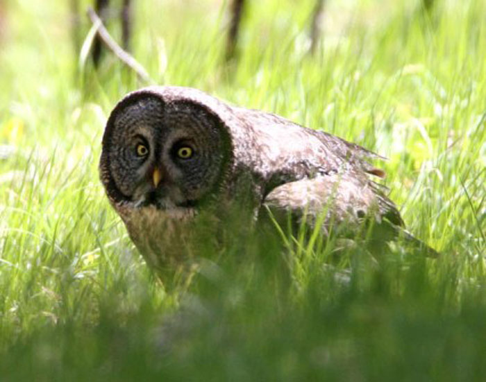 Most of the Great Gray Owl's diet is made up of small rodents like voles and pocket gophers. Occasionally, it will also eat small mammals, such as shrews, and birds. To hunt, the Great Gray Owl perches on a tree overlooking an open area. Good hearing allows the owl to accurately locate prey below several feet of snow. From its perch, the Great Gray Owl plunges through the snow to capture its prey.