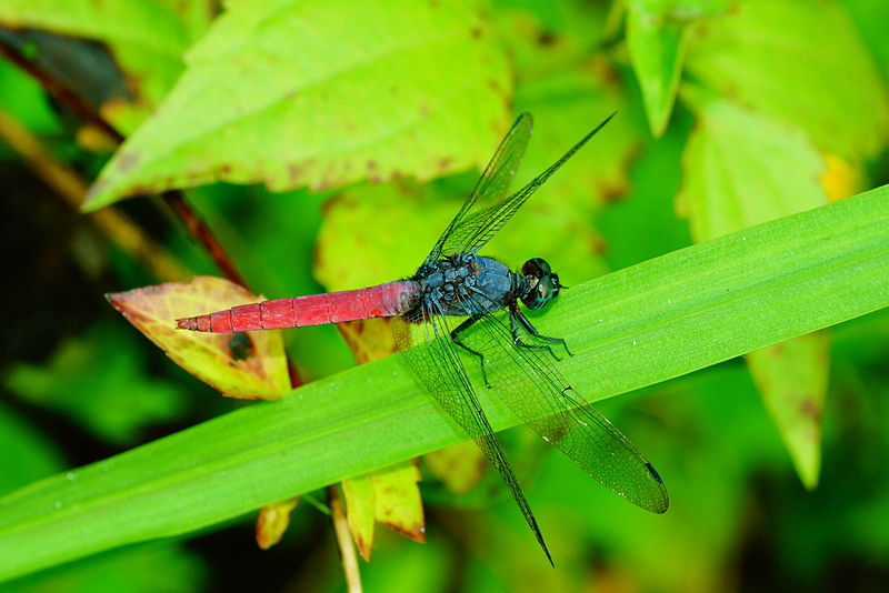 The male blue-faced meadowhawk is red with a blue to turquoise face.