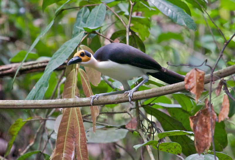 The white-necked rockfowl has a naked bright yellow and black head.