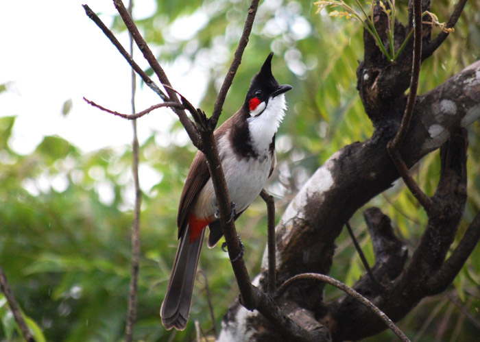 Pycnonotidae - bulbuls There are about 125 species of birds in this family. They are 5-11 inches in length and are found in Africa and Asia. They have thin, downcurved bills; short wings; and a medium to long tail. Some species have crests on their heads. They are usually a drab brown, olive, or gray in color. Some species have patches of red, yellow, green, or white. They are found in forests and cultivated areas. They eat mostly fruits and berries, but they may also eat some insects. They are very active and are good singers! The red-whiskered bulbul (Pycnonotus jocosus) is native to Southeast Asia, but can be found around Miami, Florida. It is thought that some birds that were part of a captive group at a tourist attraction escaped during Hurricane Donna in 1960! It is grayish on its uppersides and white on its undersides. It has a black crest on its head and red patches on its cheeks and on the underside of its tail. It is found in gardens, parks, and yards! World Status Key US Status Key
