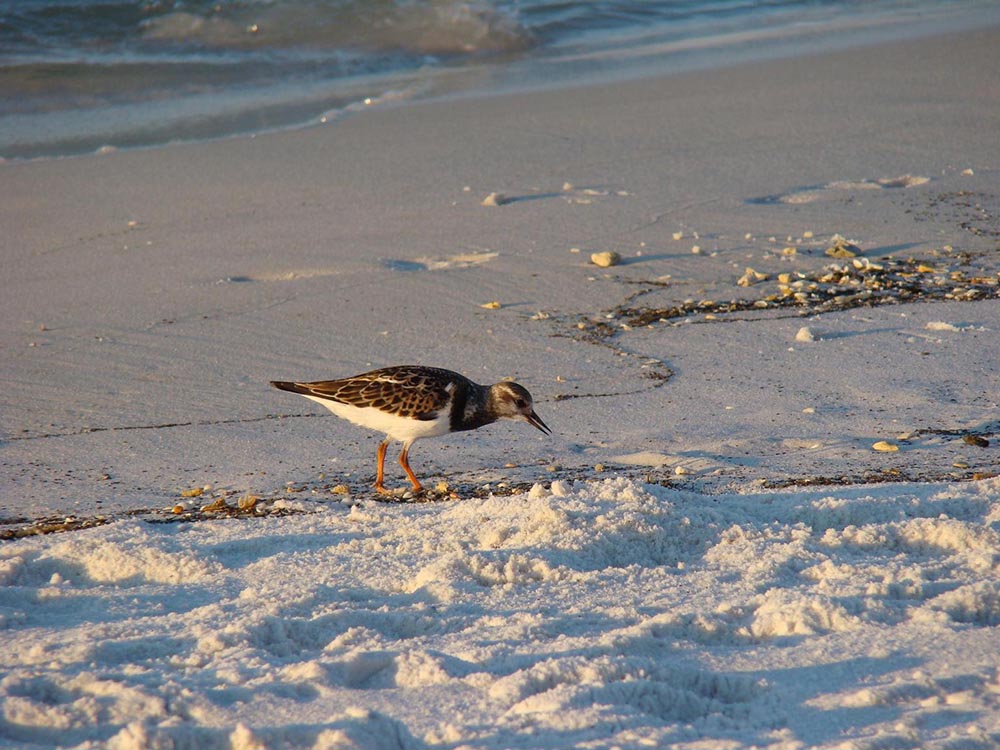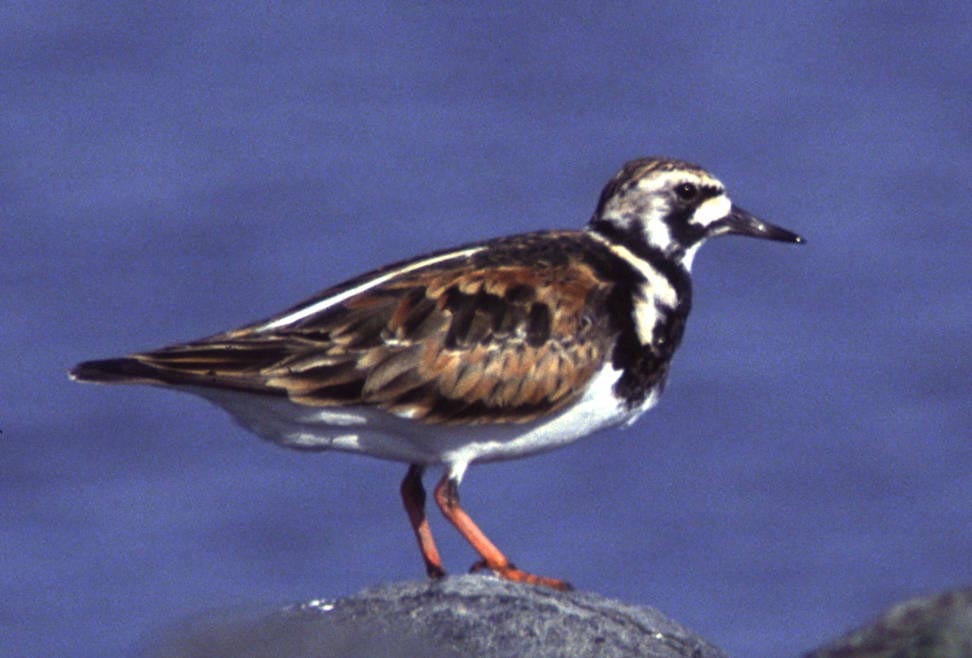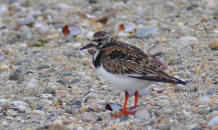 The ruddy turnstone is a short-legged shore bird that is about 7 inches in length. It has a short, dark bill that is slightly upturned at the end; black and white markings on its head; and a black patch on its chest. It legs are yellow to orange-red. In summer, its uppersides are a combination of white, rusty-red and black. In winter, it is grayish-brown above.
