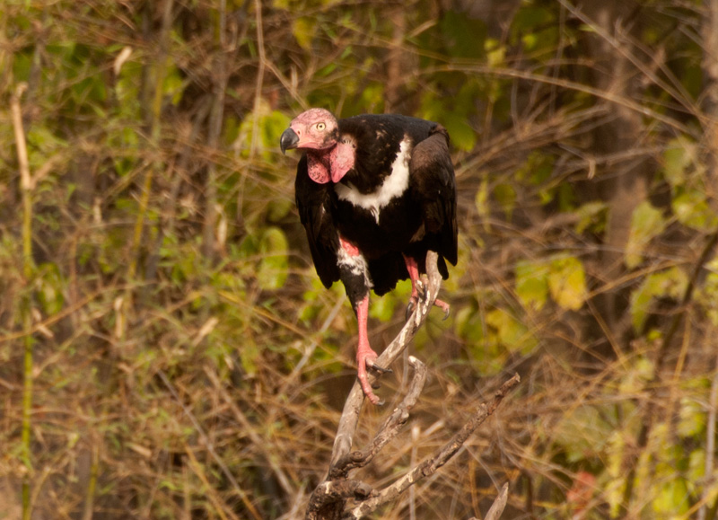 The white-headed vulture has a bare, pink face and a bright orange-red bill with a blue base.