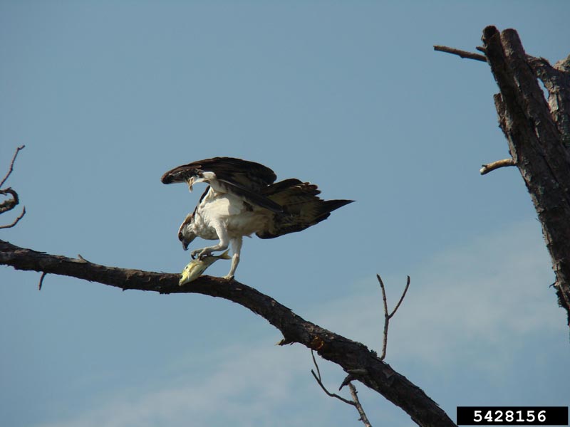The osprey is perfectly adapted for catching fish! It has powerful legs and pale gray feet with sharp talons that help it catch fish. The osprey's feet have rough, pointed scales on them that help the osprey hold onto the fish it catches. Its feet have two toes pointing backwards that also help the osprey grab and hold onto fish.