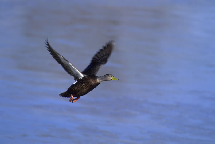 Like other dabbling ducks, the American black duck takes off straight from the water to fly. Diving ducks have to run across the water to get up enough speed to launch themselves into flight.