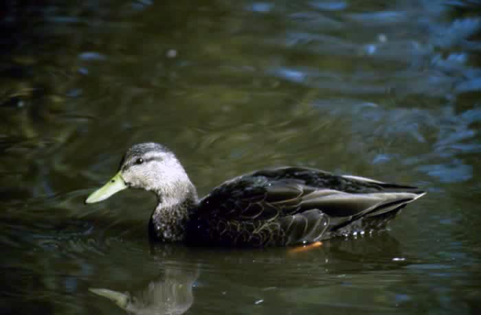 The American black duck is not really black; it is more of a dusky brown. In fact, it is sometimes called the dusky duck. It is 19-22 inches in length. Its neck and head are a lighter color than its body. Its bill is olive-yellow to orange, and its wings are white on the underside and have a purplish-blue patch on the upperside. Males and females look alike, but the female is a little lighter.