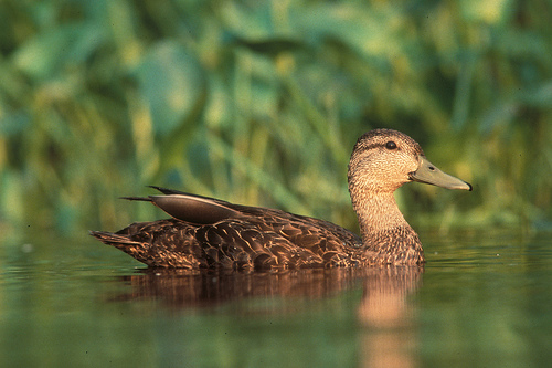 The American black duck is a dabbling duck and feeds in shallow water. It tips its head down and lifts its tail up so it can probe or dabble in the mud and water for submerged plants and seeds. It also eats mollusks, crustaceans, insect larvae, tadpoles, small fish, and frogs. It sometimes skims the surface of the water for seeds and aquatic invertebrates. |