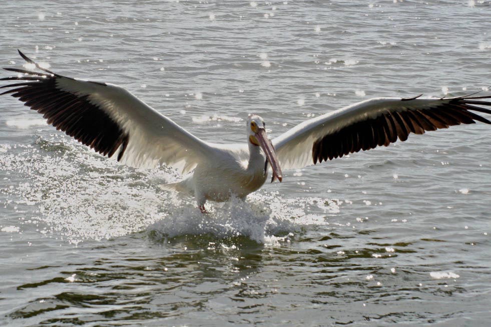 The American white pelican lives on inland shallow freshwater lakes, wet prairies, and marshes in the summer and on coastal lagoons in the winter.