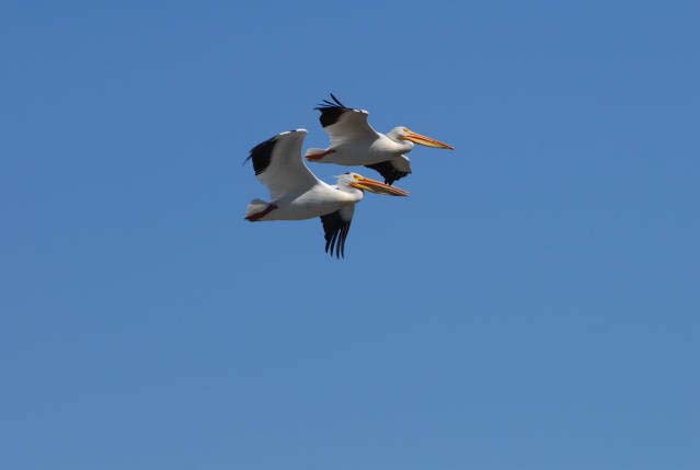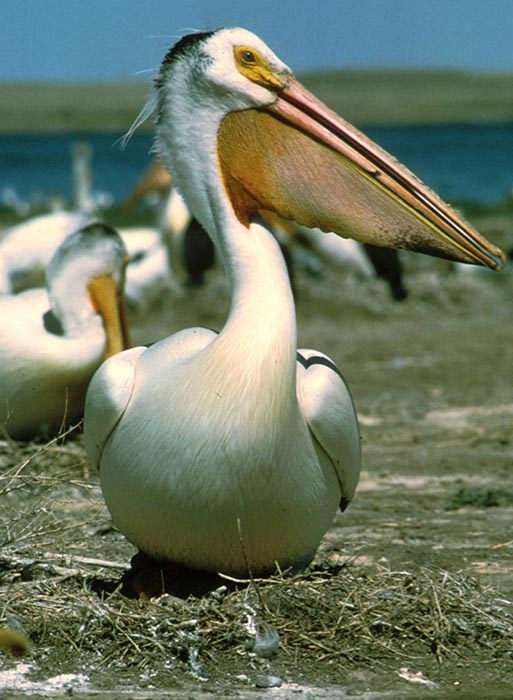 The American white pelican nests in colonies. Male and female American white pelicans show off their bright orange bills during courtship. They strut around, bow, and take short flights in an attempt to attract a mate.