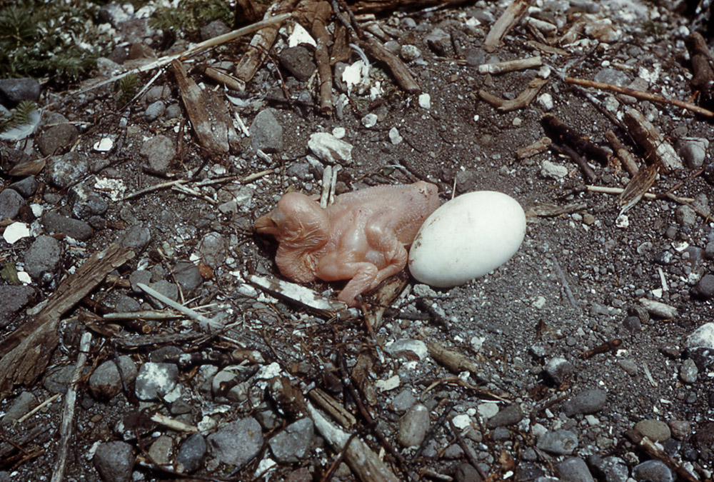 The female lays 1-3 eggs in a depression on the ground or on a mound of vegetation and dirt. Both parents incubate the eggs with their large webbed feet! The eggs hatch in about a month. If the female lays more than one egg, usually only the strongest chick survives. The other chicks die of starvation because they can't compete for food with their stronger sibling.