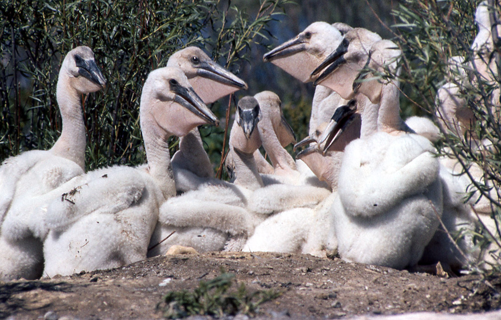 Chicks are naked at birth. By the time they are 10 days old they are covered with white down. Both parents care for the young. The chicks dig regurgitated food out of their parents pouches. Chicks leave the nest and join the a pod or a crèche of young pelicans when they are 17-28 days old. Chicks fledge when they are about 10 weeks old.