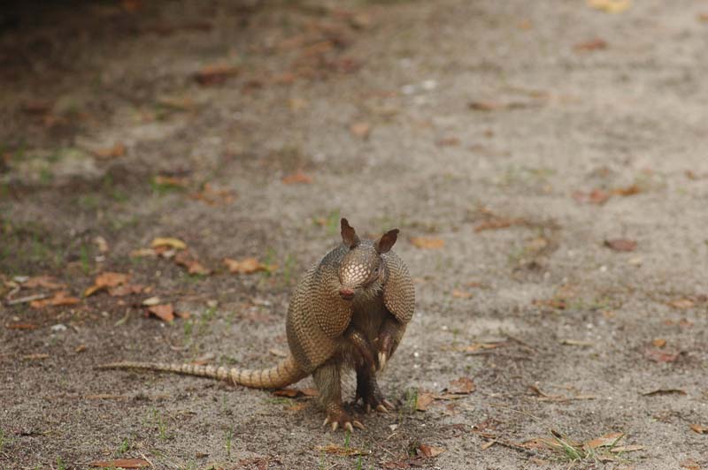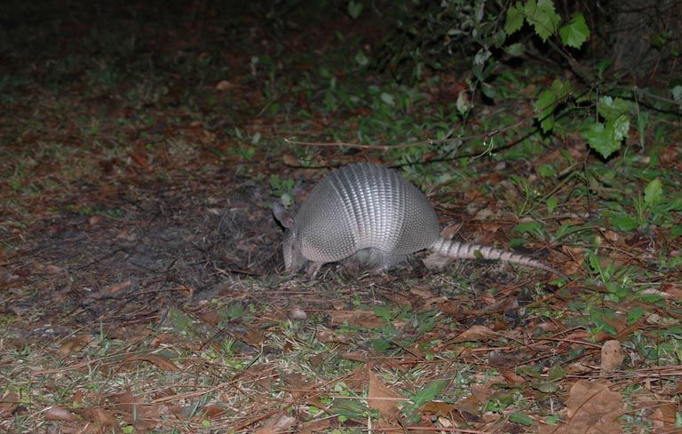 The nine-banded armadillo lives in bottomland hardwood forests, scrub, and brushlands. It prefers areas with soft soil that it can burrow into. It is usually found near water sources like streams, creeks, and water holes. An armadillo may have more than one burrow.