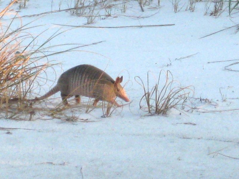 With so little fur, the nine-banded armadillo is very sensitive to temperature. In the winter, it is usually active only during the warmest part of the day. In the summer, it is active at night when it is cooler. If temperatures drop too low, the armadillo can die.