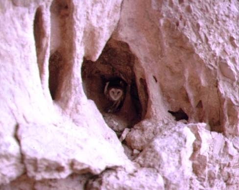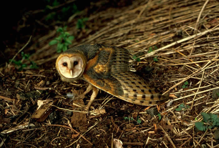 The female barn owl lays five to ten eggs at a rate of one egg every two to three days. She lays her eggs on bare wood or stone in buildings, tree hollows, caves, or burrows. The owlets hatch in 32-34 days, and both parents feed them. The owlets hunt on their own when they are about two months old. Because the barn owl has a life expectancy of only about two years, females often have two broods a year.