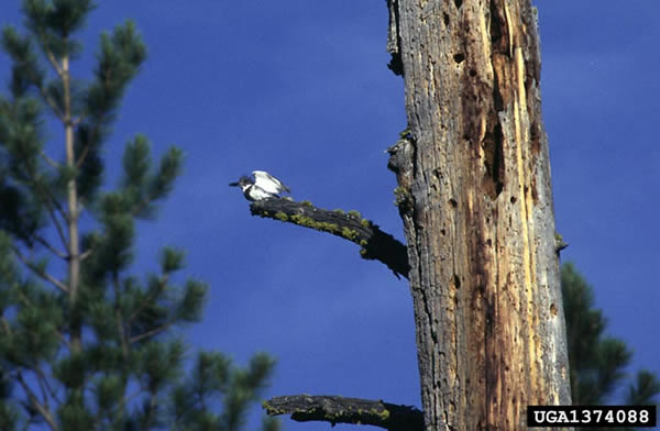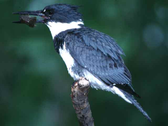 belted kingfisherThe belted kingfisher hovers or perches above clear water looking for prey. Once it spots its prey, it dives headfirst towards the water and snatches up its prey at, or just below, the surface of the water. It returns to its perch and beats its prey against a tree branch to stun it. It then tosses its prey into the air, catches it headfirst, and swallows it! The belted kingfisher also eats frogs, toads, crayfish, crabs, mice, salamanders, lizards, and insects.