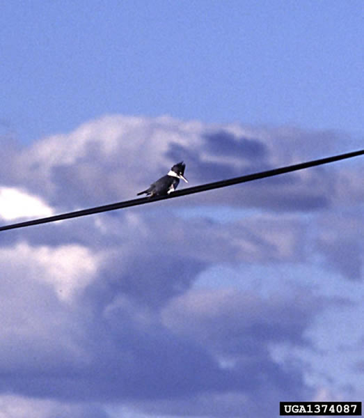 belted kingfisherThe belted kingfisher is a stocky bird. It is 11-14 inches in length with a wingspan of 18-23 inches. It has a large head with a shaggy crest; a long, thick, sharp bill; small legs and feet; a white spot by its eyes; and a short barred tail. It is slate blue on its head, upper breast, back, wings, and tail. It has a white belly, a white collar around its neck, and a slate-blue breast band. Males and females look alike, but the female may have rusty red band on her belly.
