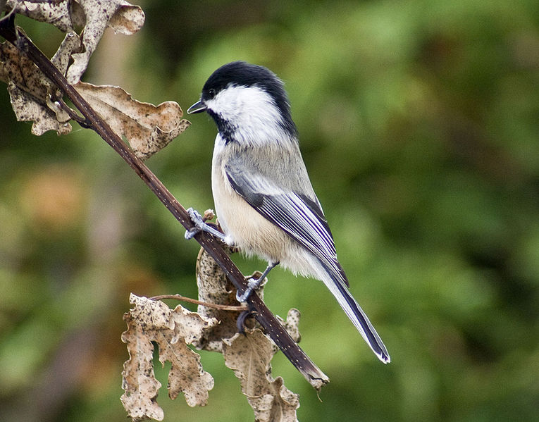 The black-capped chickadee lives in mixed deciduous and coniferous forests. In winter it is found in residential areas with trees.