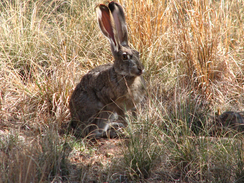 The black-tailed jackrabbit has long ears with black tips and very long front and rear legs. It is about 18-24 inches in length and weighs four to eight pounds. It has peppery brown fur and a black stripe that runs down its back.