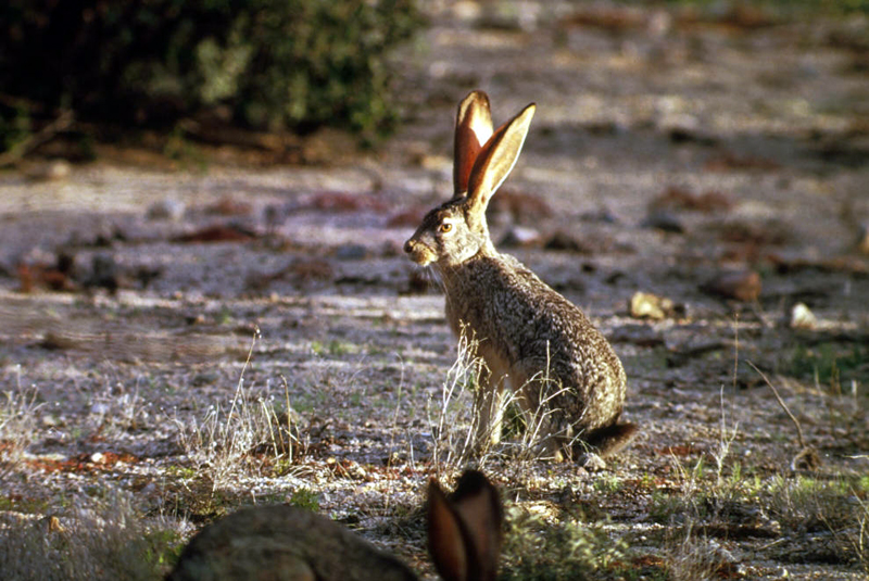 The black-tailed jackrabbit is not really a rabbit; it is a hare because its young are born with fur and with their eyes open. Males and females look alike, but females are usually larger.