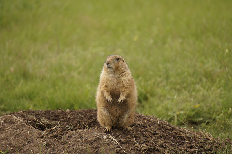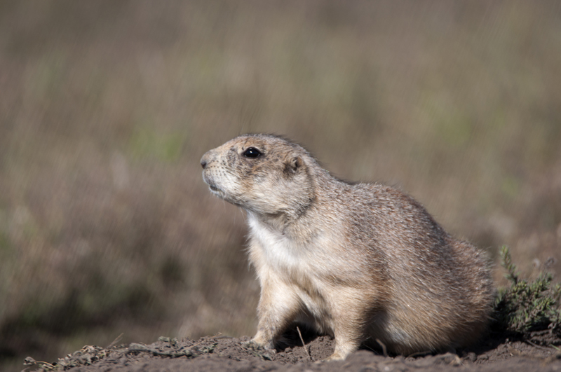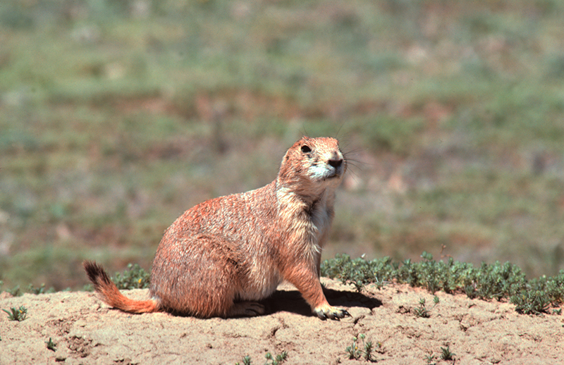 The black-tailed prairie dog is a member of the squirrel family and is closely related to the ground squirrel. It has yellowish to reddish-brown fur on its back and sides and lighter colored fur under its neck and on its chest. It has small ears on the sides of its head; a long body; small front paws with long claws; and a short, black-tipped tail.