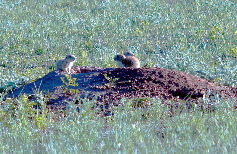 Habitat The black-tailed prairie dog lives in burrows in dry prairies with short grass. Their burrows have an entrance that is surrounded by a pile of dirt. The entrance to a prairie dog burrow looks a little like a volcano. The mound of dirt protects the burrow from flooding and is a good place for the prairie dog to sit and watch for predators like badgers, coyotes, foxes, bobcats, eagles, and hawks. The burrow entrance leads to a tunnel that goes down about three to ten feet and then straightens out to a horizontal tunnel that runs about 10 to 15 feet. The burrow has a number of nesting chambers lined with grass. It also has a separate chamber used as a bathroom. When that chamber is full, the prairie dog will dig a new one.