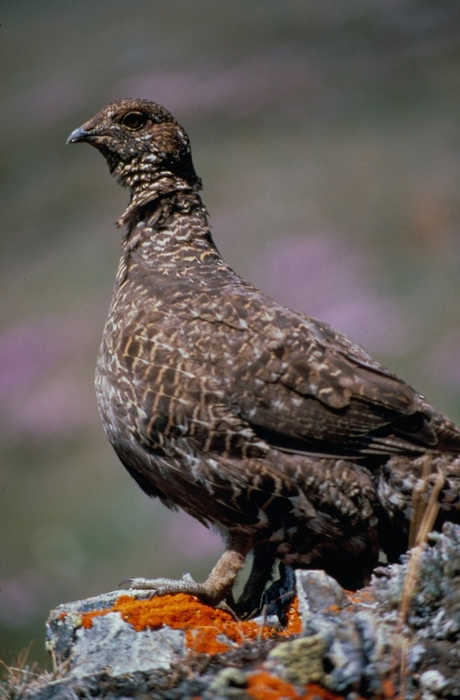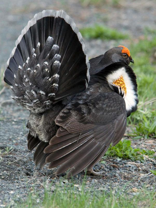 During mating season, the male sooty grouse often perches on a log or post and calls out with a loud booming hoot that can be heard for miles. The comb over his eyes stands up, and he fans out his tail and puffs out his neck to display his neck sac. |