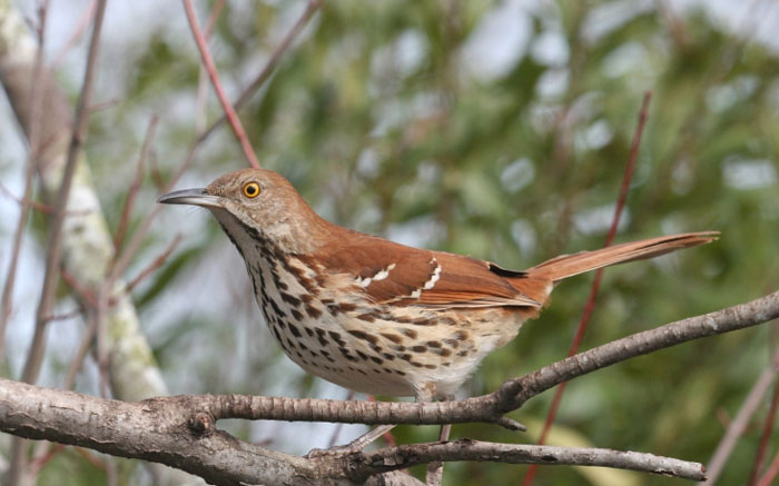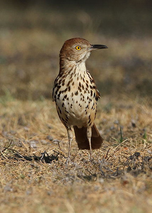 The Brown Thrasher is a gangly songbird. Its long, sturdy legs hold up its large, slender body. The Brown Thrasher has a brown head, back, wings and tail with heavy brown streaking on its white chest and belly. Its eyes are bright yellow. The Brown Thrasher is an exuberant and varied singer.
