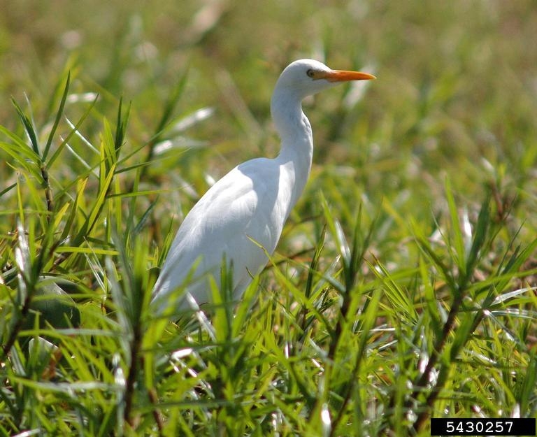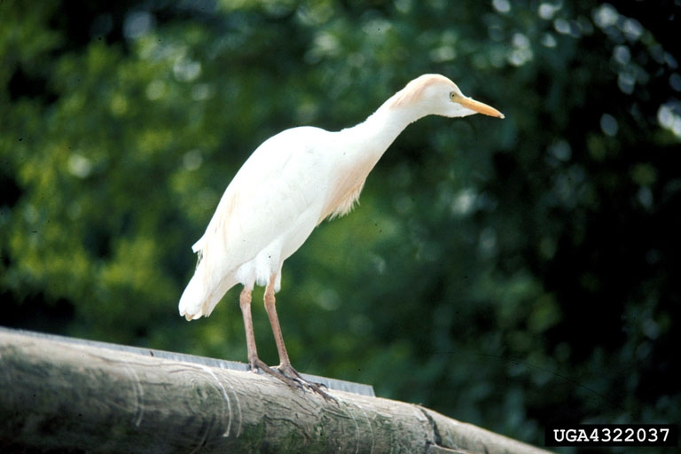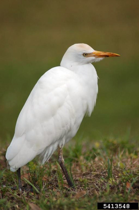 The cattle egret is a small white heron about 19-21 inches in length with a wingspan of about three feet. It often looks like it is hunched over. It has short legs and a thick neck compared to other species of egrets.