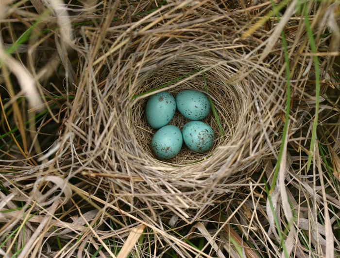 The male clay-colored sparrow reaches the breeding territory first. He sings to attract a mate and defend his territory. The female builds an open-cup nest of twigs, weeds, and grass. The nest is made close to the ground in a shrub. She lays 3-5 blue eggs and does most of the incubating. The male helps out a little and feeds the female during incubation. Incubation takes about 10-12 days. Both the male and the female feed the chicks. The chicks fledge when they are about 8-9 days old, but their parents will continue to feed and care for them for another week.