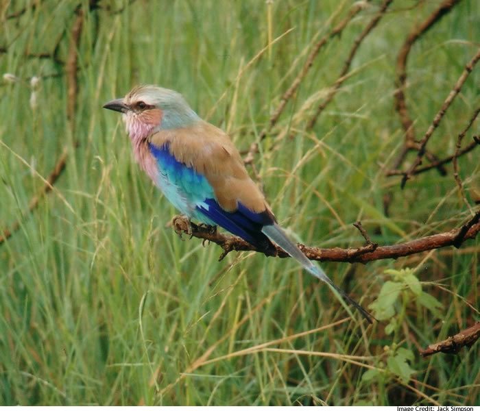 The lilac-breasted roller is found in Angola, Botswana, Burundi, Congo, Ethiopia, Kenya, Lesotho, Malawi, Mozambique, Namibia, Rwanda, Somalia, South Africa, Swaziland, Tanzania, Uganda, Zambia, and Zimbabwe.