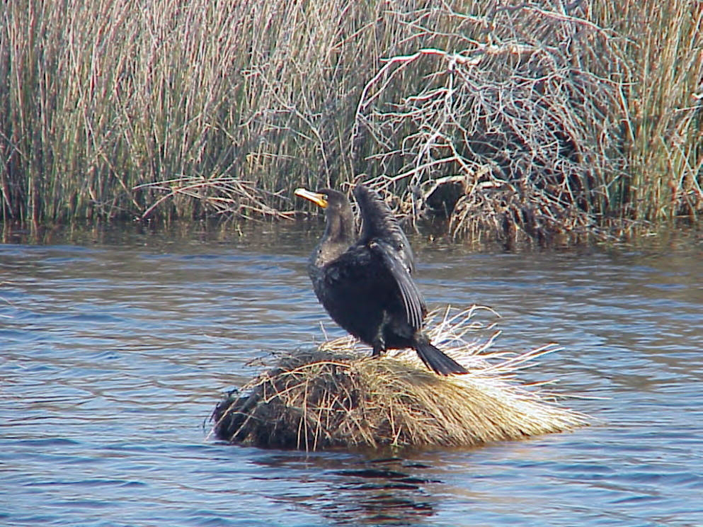 The double-crested cormorant doesn't have well-developed oil glands and its feathers don't have very good waterproofing. It often dries its feathers by perching on a pole or tree limb and stretching its wings out.