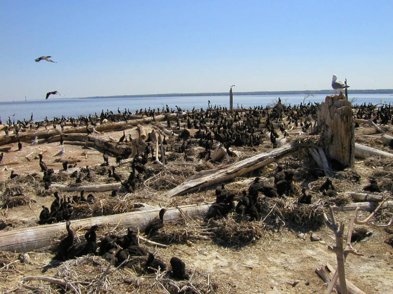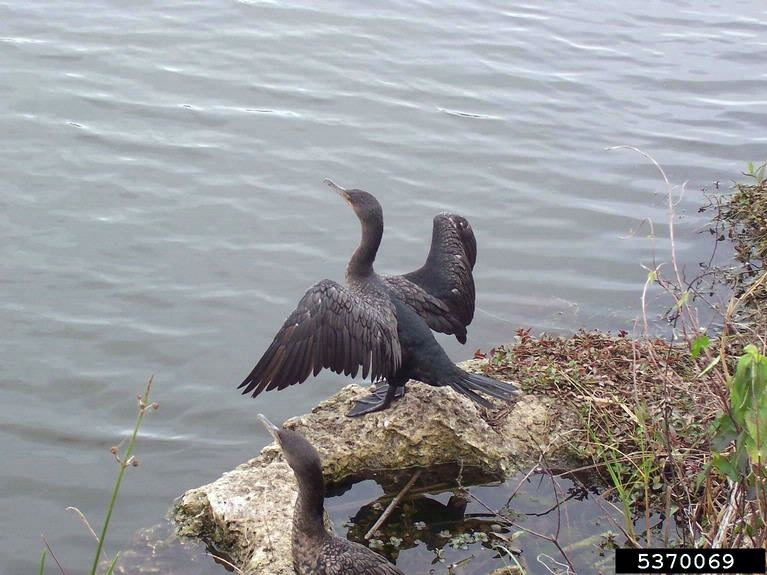 The double-crested cormorant is a little more than two feet in length with a wingspan of about four feet. It has dark brown to black feathers, a long hooked bill with an orange throat pouch, a long tail, and webbed black feet. Adults have tufts of feathers over their eyes. Males and females look alike.