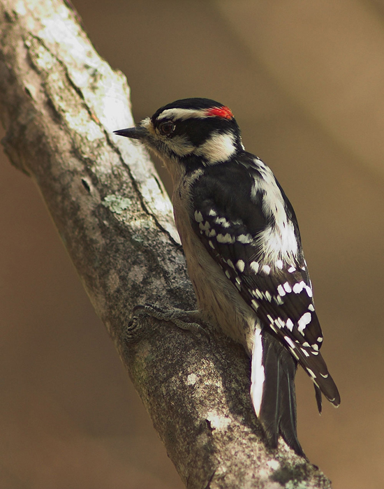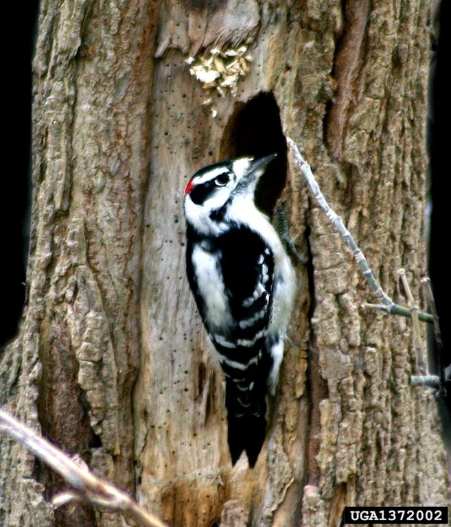 The downy woodpecker lives in woodlands, parks, and yards.