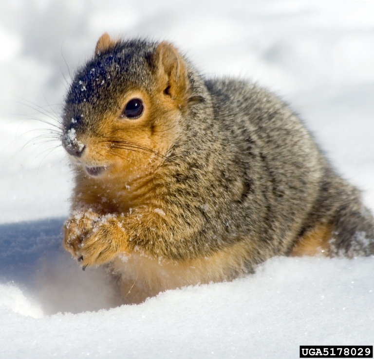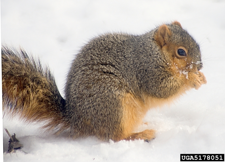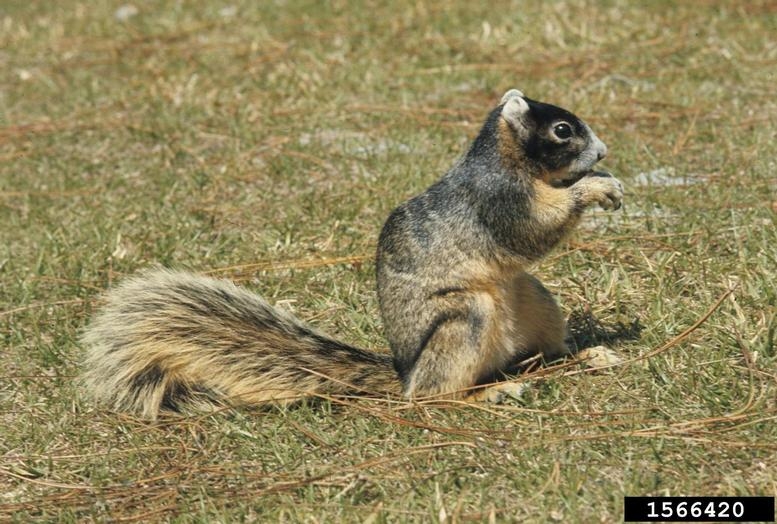The fox squirrel is the largest tree squirrel. It is 10-15 inches in length. It has three distinct color patterns. In the northeastern part of its range, it is gray above with yellowish undersides. In the western part of its range, it is gray above and rust colored on its undersides. In the southern part of its range, it is black and brown with a white stripe on its face and a white tip on its tail. The fox squirrel is also known as the eastern fox squirrel.