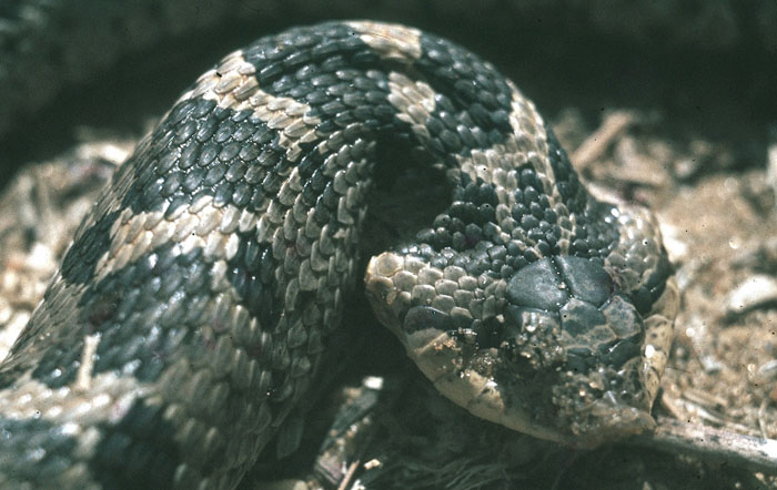 The hognose snake is sometimes called the puff adder. When it is threatened, it raises its head and puffs out and flattens the skin around its neck - like a cobra. It hisses loudly, and lunges towards the threat. It is all a show! It lunges with its mouth closed! If that doesn't work, it rolls over onto its back, open its mouth, hangs it tongue out of the side of its mouth, and plays dead. It may play dead for several minutes before carefully turning over and looking around to see if it is safe. If it is rolled back onto its belly when it is playing dead, it will roll back onto its back! |