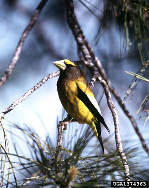 The evening grosbeak is a common visitor to bird feeders and is especially fond of sunflower seeds.