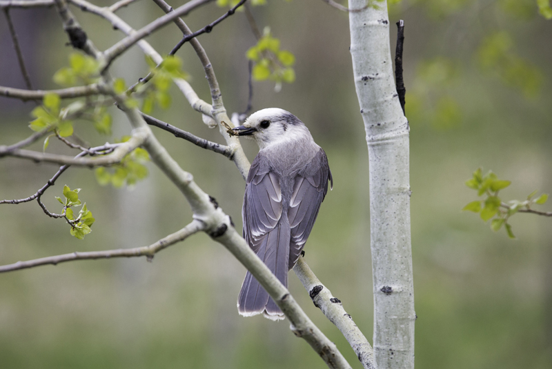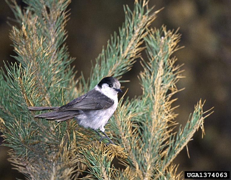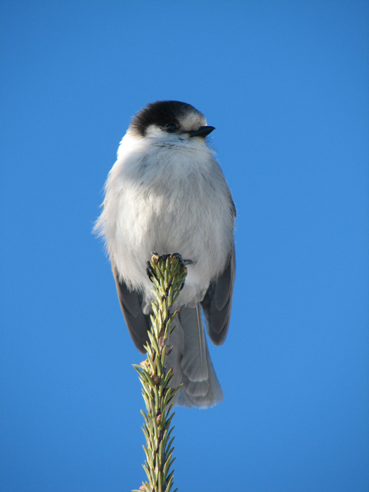 The Canada jay, also known as the gray jay, is about 10 inches in length. It is gray on top and grayish-white on its undersides. It has a white forehead and throat. It has a darker gray cap and nape and a short, dark bill.