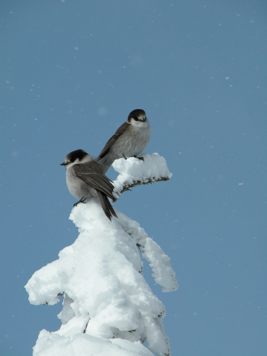 The Canada jay mates in the spring. The male chooses a nest site, usually in a conifer tree like the spruce or fir, and then he begins building the nest. The bowl-shaped nest is made of twigs, grass, lichen, moss, and bark that are fastened together with spider webs and insect cocoons. The nest is lined with grass, moss, fur, and feathers. The female helps build the nest. It can tak up to three weeks for the pair to complete the nest.