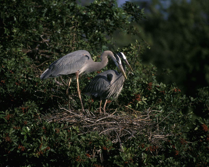 The female great blue heron lays 3-7 eggs on a shallow platform made of sticks and twigs and lined with soft material. The nest is usually in a tall tree, but it may be built in the reeds or on a cliff edge. The eggs hatch in about a month and the chicks fledge when they are about two months old. Great blue herons nest in colonies. They usually nest in the same spot from year-to-year. They may even use the same nest.