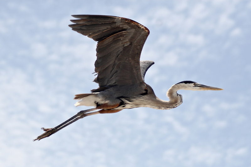 Behavior The great blue heron migrates in the fall, although some populations in the southern part of their range stay where they are. The great blue heron usually tucks its head into an S-shape when it is resting and flying.