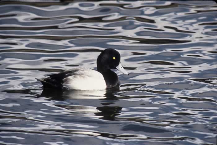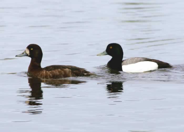 The greater scaup is a medium-sized diving duck. It is 15-22 inches in length with a wingspan of about 28-30 inches. It has a rounded head, bright yellow eyes, and a grayish-blue bill with a black tip. The male has a black chest and tail, white sides, and a barred gray back. His head and neck look black, but they are actually a greenish-black. The female is brown and has a white patch at the base of her bill. Both the male and the female have a white wing stripe and a white belly. The greater scaup looks very similar to the lesser scaup.