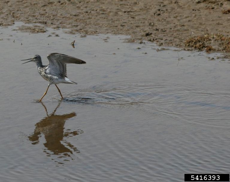The greater yellowlegs' call is a series of musical whistles. It is a very noisy bird. It often runs in shallow water and bobs its head up and down when it spots a potential predator. It has a high-stepping walk and sometimes runs with its neck stretched out. It also swims on the water from time to time to get to shallow water or to escape from a predator. It is more solitary than most shorebirds, but it does migrate in groups.